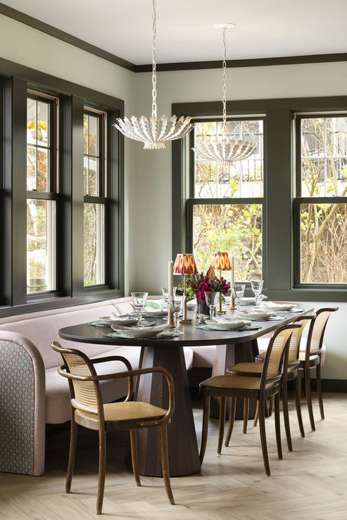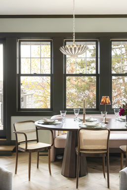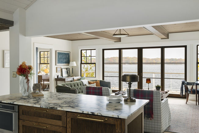 The Dining Room is a showstopper—completely surrounded by windows that frame stunning lake views. We chose sophisticated dark green trim paired with lighter green walls to create a serene, nature-inspired atmosphere. A custom gas fireplace (without a screen for authentic warmth) anchors one end of the room, creating an inviting focal point. In the center sits a cozy conversation area where family and guests naturally gather.